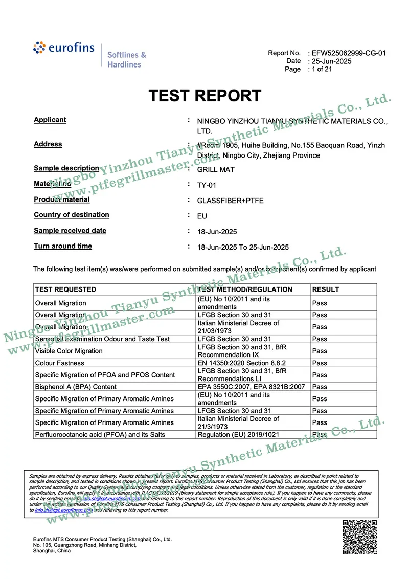 At Ningbo Tianyu, we prioritize safety and performance. Our PTFE grill mats are independently verified to contain no detectable levels of over 400 harmful PFOA, PFOS, and PFAS compounds, aligning with the rigorous German LFGB (Food and Feed Code) requirements. This ensures a non-toxic grilling experience, making our mats a reliable choice for health-conscious households and commercial kitchens worldwide.